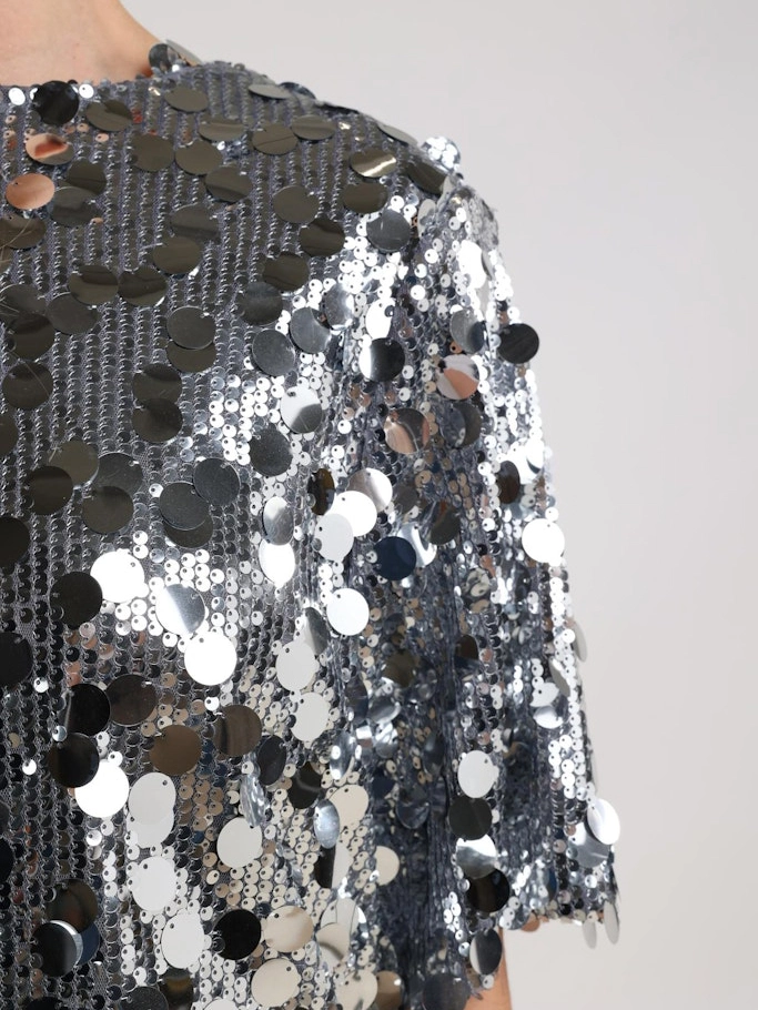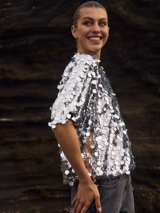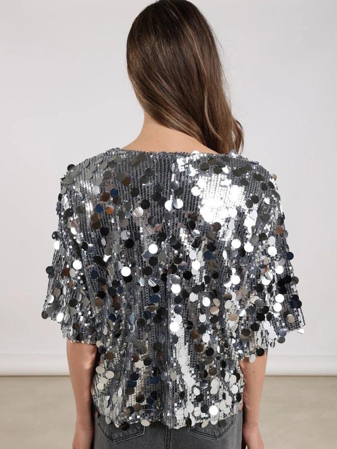 Deze stijlvolle top combineert een casual stijl met een sprankelend paillettenpatroon. Ideaal voor een trendy en elegante look. Hoogwaardige kwaliteit en eenvoudig te combineren voor elke gelegenheid.