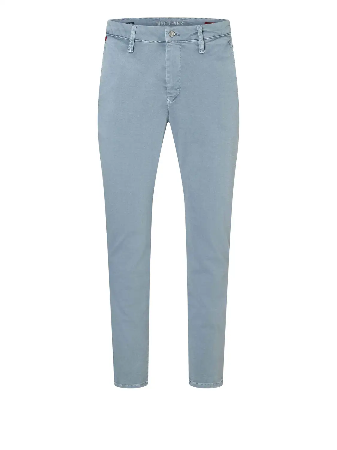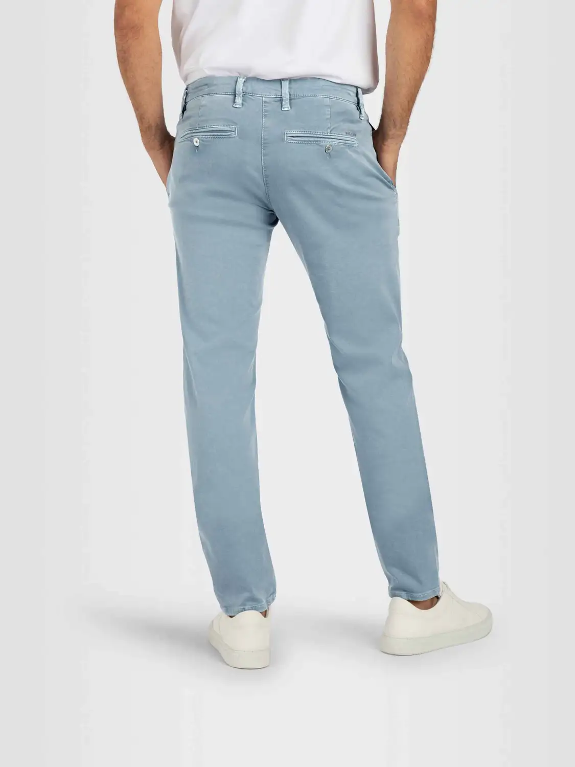 Modern fit. Luchtig stretchkatoen. Paspelzakken met knoopsluiting op het achterpand.