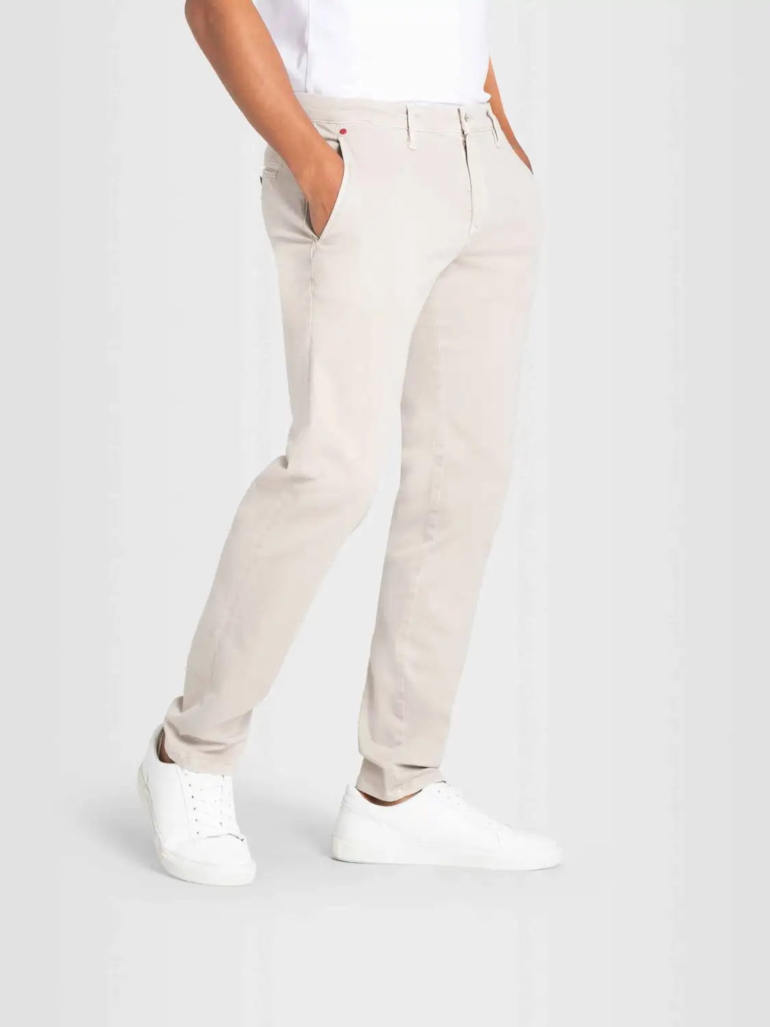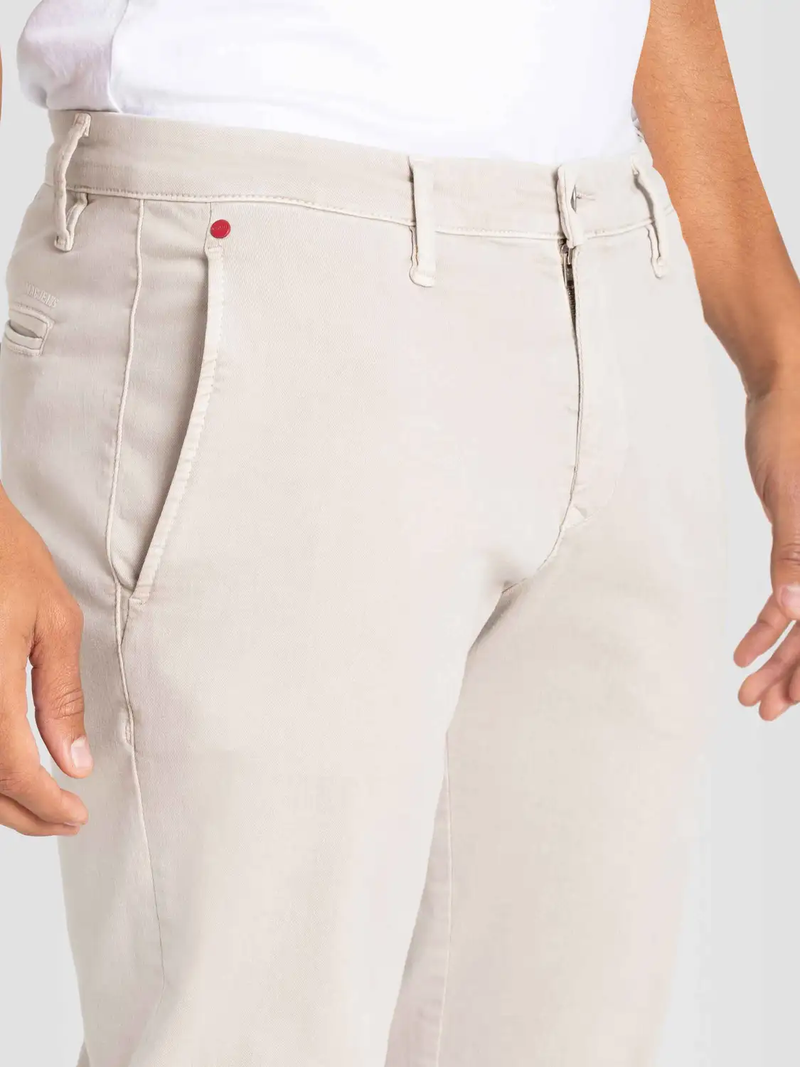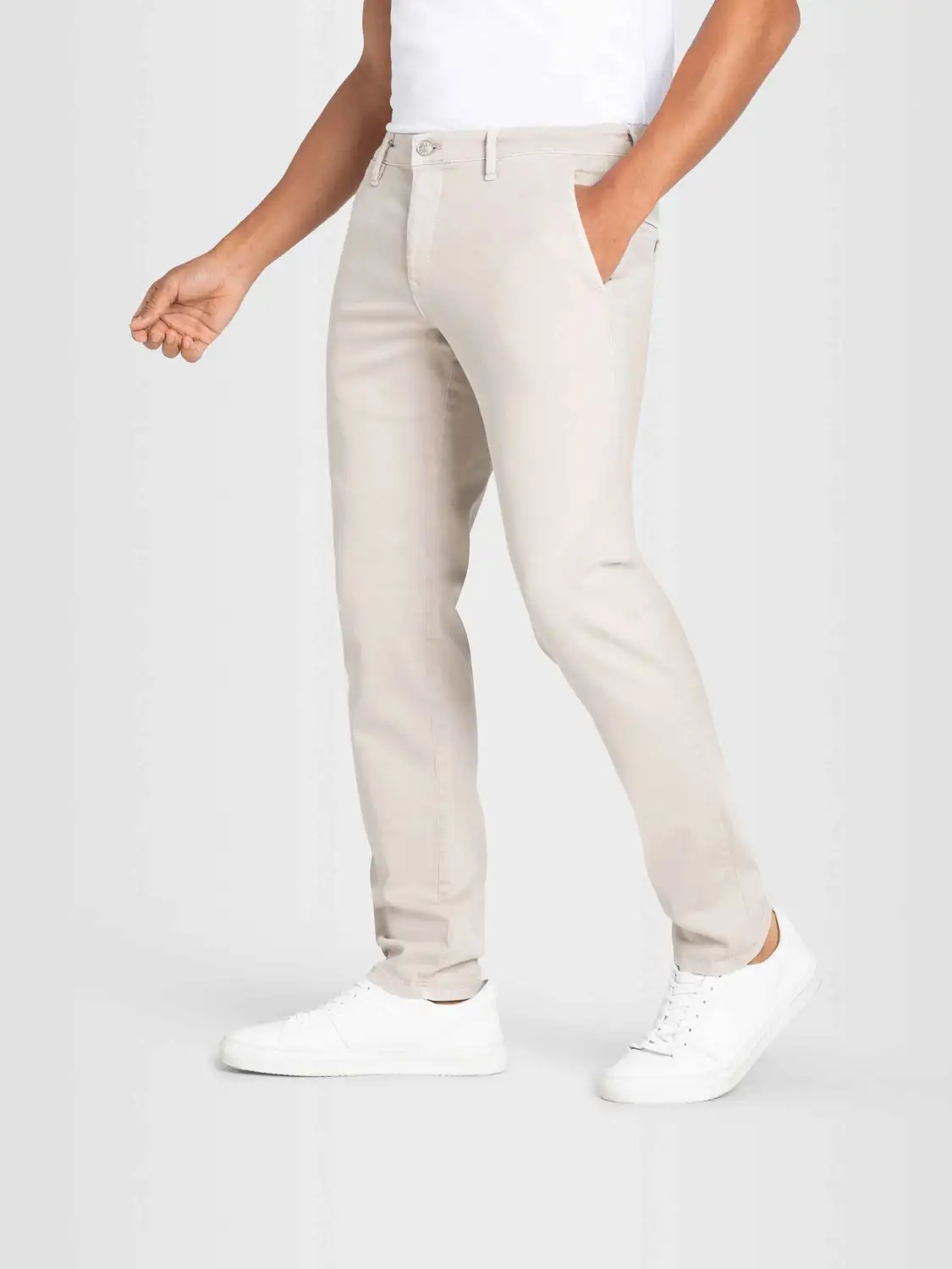 Modern fit. Luchtig stretchkatoen. Paspelzakken met knoopsluiting op het achterpand.