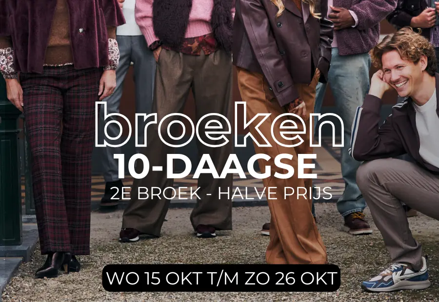 Tijdens onze broeken 10-daagse zijn onze winkels op koopzondag 19 & 26 oktober 2025 van 12.00 tot 17.00 uur geopend!